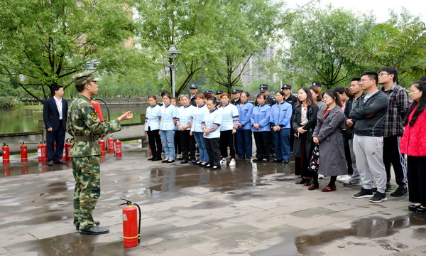 仪式结束后,由学校党委武装部、保卫部(处)组织,邀请新都区消防队战士对各二级院系的辅导老师、学校图书馆工作人员及学校保卫人员进行灭火救援培训,并现场组织了灭火扑救。