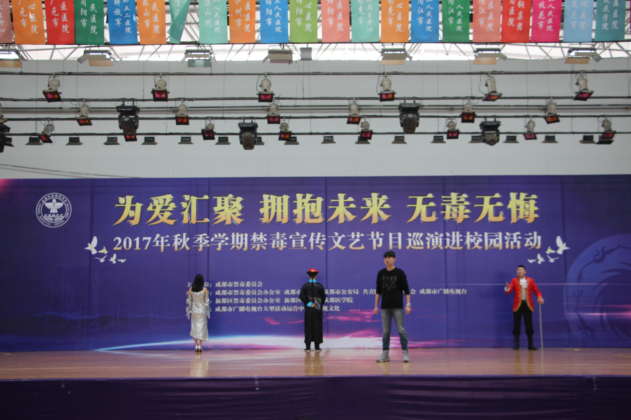 11月2日中午,由我校联合成都市禁毒委员会、成都市广播电视台联办的大型禁毒“舞台剧”—《为爱汇聚·拥抱未来·无毒无悔》,在蜂巢体育馆成功演出,我校近1000余师生员工观看了演出。