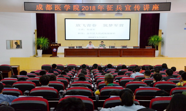 金牛区武装部部长朱建军上校,在学术交流中心作了题为《放飞青春,筑梦军营》的国防教育砖头讲座,马勇担任主持。朱建军从建设强大国防的重要性、参军入伍发展、从军的优惠政策等方面,与同学们展开了交流演讲。朱建军诙谐幽默、慷慨激昂的演讲,给同学们留下了深刻印象。