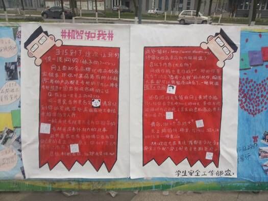 3月15日是国际消费者权益维护日。14日上午,伴着暖阳,成医安工部便把3·15的宣传展板早早准备好,以提示成医师生们3·15快到了,抓紧时间宣传维权知识。3·15当天,成医安工部的成员们继续在微博上把宣传工作做踏实。主要通过转载3·15经典段子教师生们学会辩真伪,如“北京消防的李逵OR李鬼”,以及一些社会上已发生的恶性事件如“不要被假警察骗了”“辣条的生产过程”等亦庄亦谐的形式来让厂商反思,让消费者提高监督意识。最后转发一条新《消法》,让爱网购的人们聪明起来并开展了微博互动,小礼相送活动。
