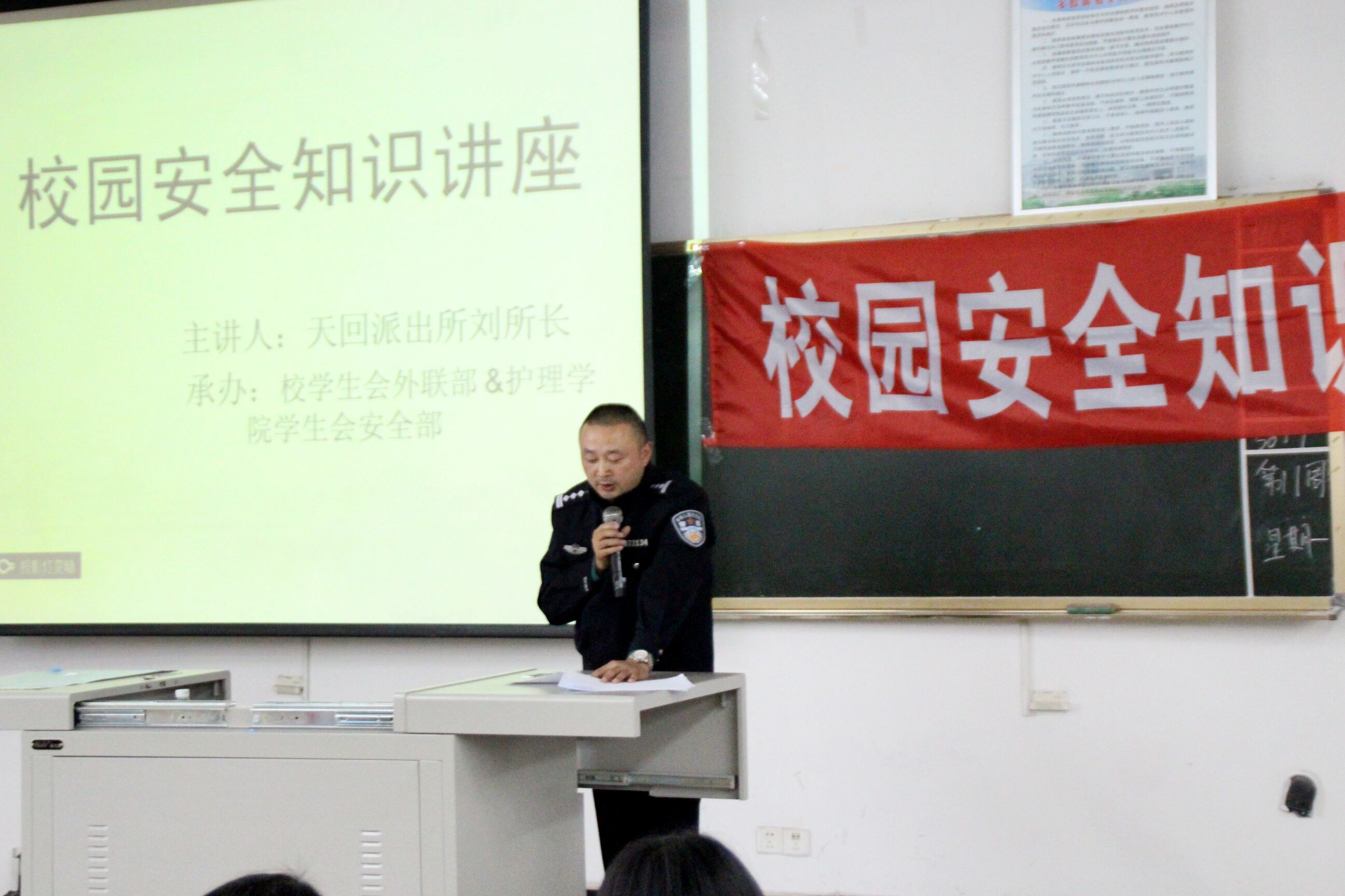 11月9日下午,由武装部·保卫处指导,校学生会和护理学院学生安全部承办的校园安全知识讲座在天回校区教学楼207教室举行,天回派出所刘伟副所长、罗谋全警官应邀出席,保卫处孙刚峰科长、王军科老师、护理学院辅导员及2015级新生等200余人参加此次讲座。
